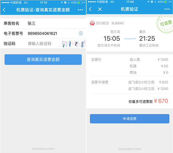 随着美团点评“机票管家”的推出,用户在微信小程序输入“机票管家”或扫描“机票管家”微信小程序的二维码,输入乘客名及电子客票号,便可查询到自己在美团点评或多家OTA、航空公司购买的机票的真实退票金额及各细项情况。业内人士认为,“机票管家”小程序打破国内机票在线订购行业的“潜规则”,以更加透明的方式保证用户应有的利益,提升消费者信任度,从而促进市场良性发展。