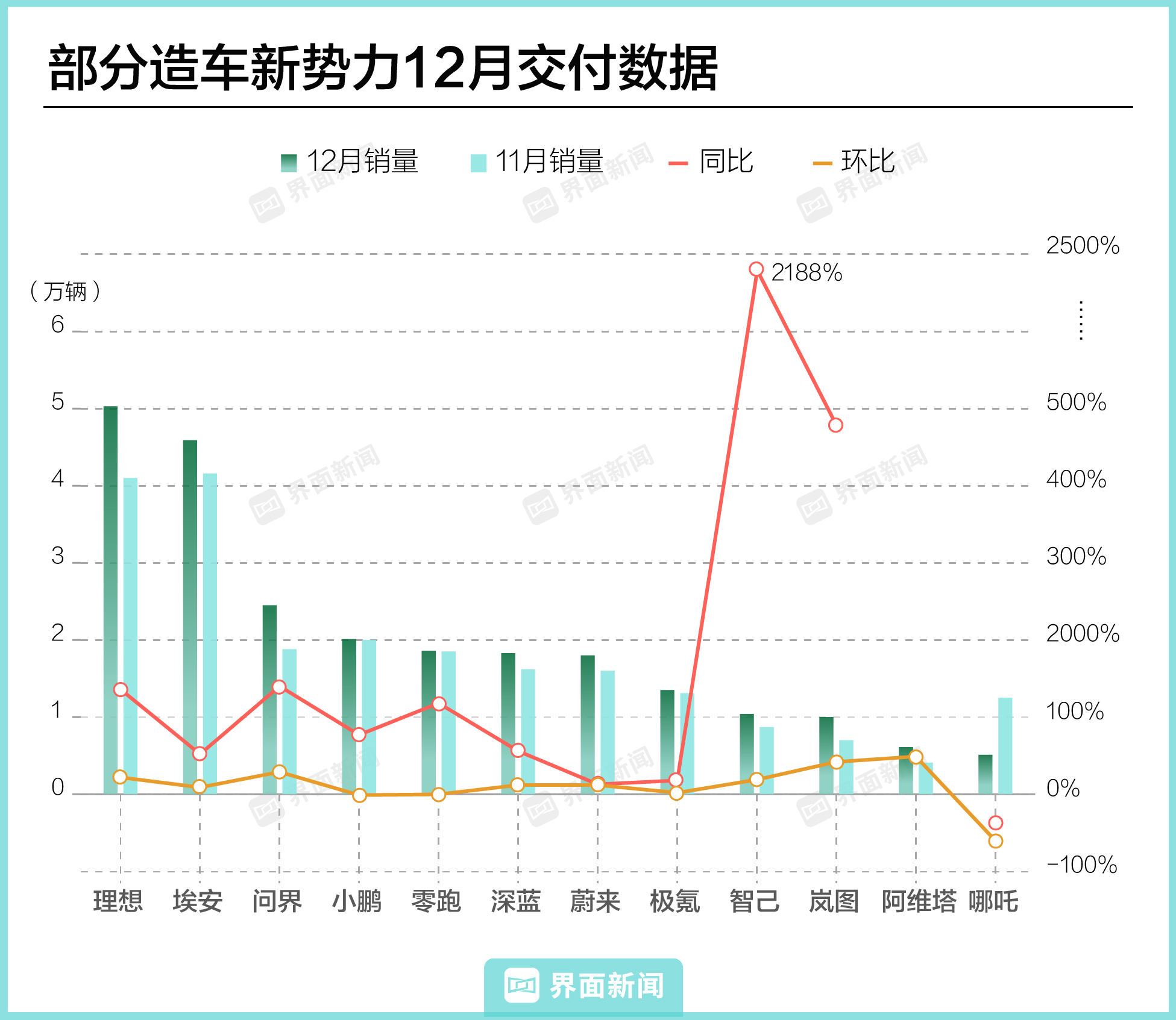 在界面新闻统计的12家新势力品牌中,有10家月销量过万,其中7家超过1.5万辆。月销量首破5万的理想最后一月反超埃安来到榜首,问界、智己、岚图等品牌创造各自最好的月销记录。榜单中,仅哪吒汽车当月交付量环比腰斩。