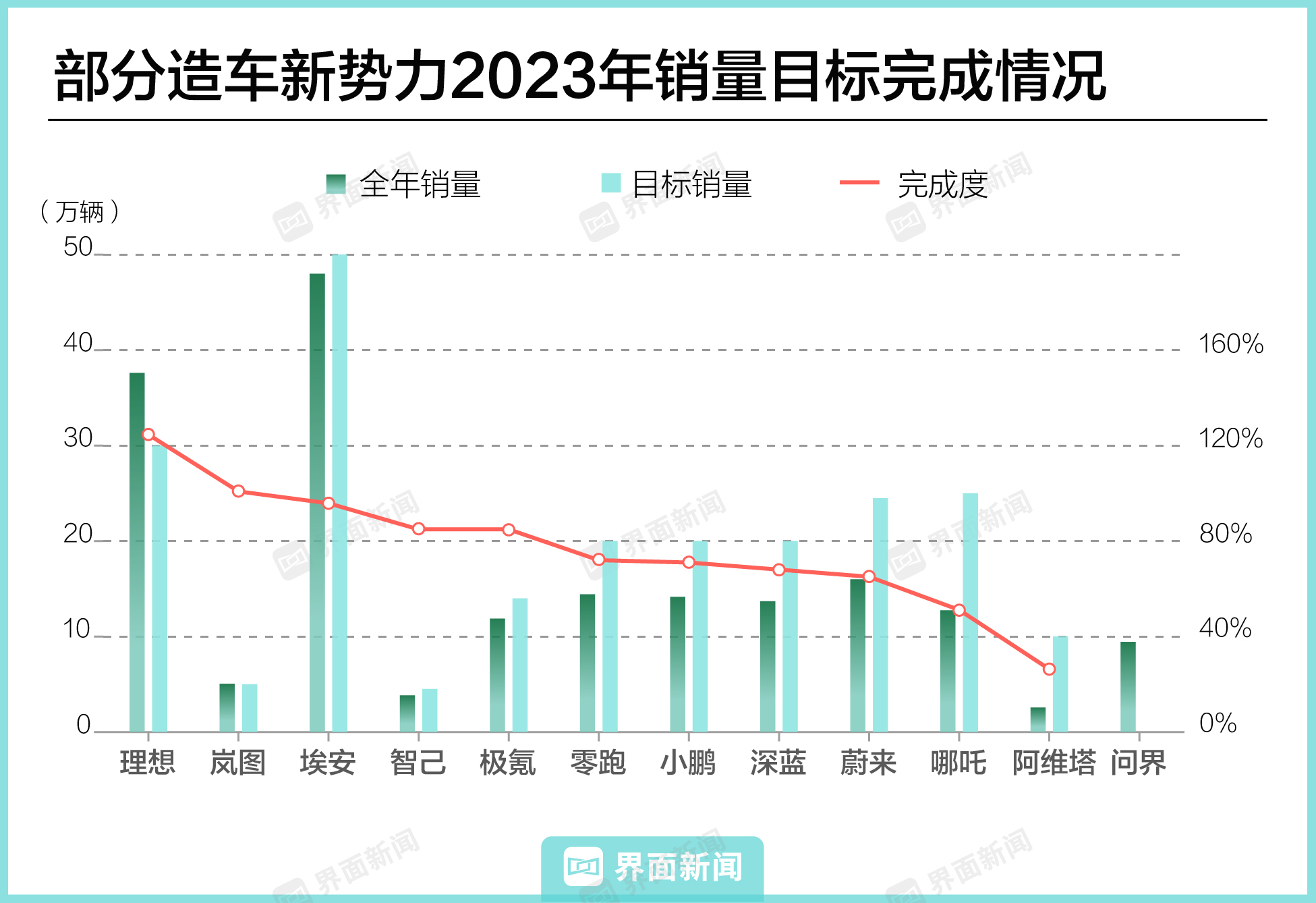 单月销量破纪录的还有岚图汽车,12月销量首次破万。从全年销量情况看,5万的绝对数值虽不突出,但已经完成品牌制定的销量目标,是本次排名唯二完成KPI的汽车公司之一。