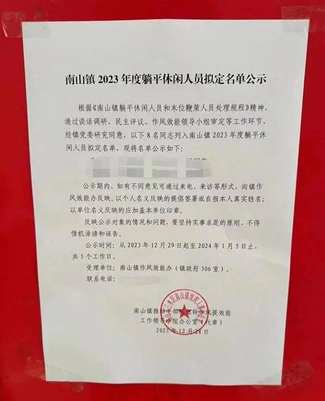 2023年12月28日,广东佛山三水区南山镇公布了8名“2023年度躺平休闲人员”。该公示由“南山镇转作风提效能办公室”发出,经过“谈话调研、民主评议、作风效能领导小组审定”等环节。