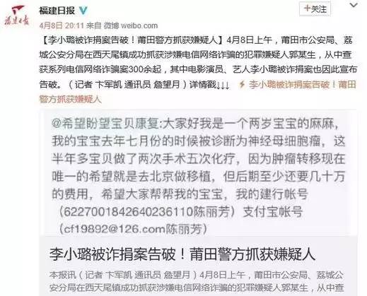去年4月,福建日报报道,有人欺诈李小璐进行捐款诈骗。演员轻信了骗子的话,公开发了微博,粉丝一看这架势,纷纷慷慨解囊,但事后这件事被证明是一场诈骗。