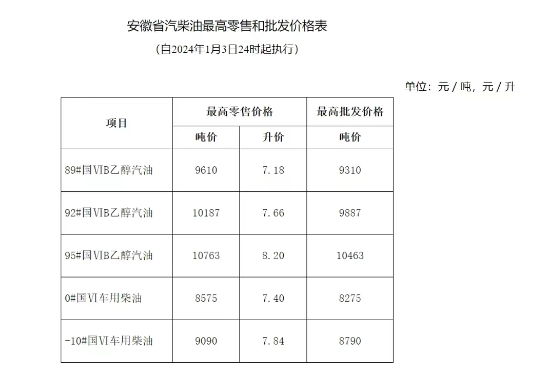 据安徽省发展和改革委员会门户网站显示,根据国家发展改革委统一安排,安徽省将对汽、柴油零售和批发价格进行调整,调整后的价格自2024年1月3日24时起执行。具体如下: