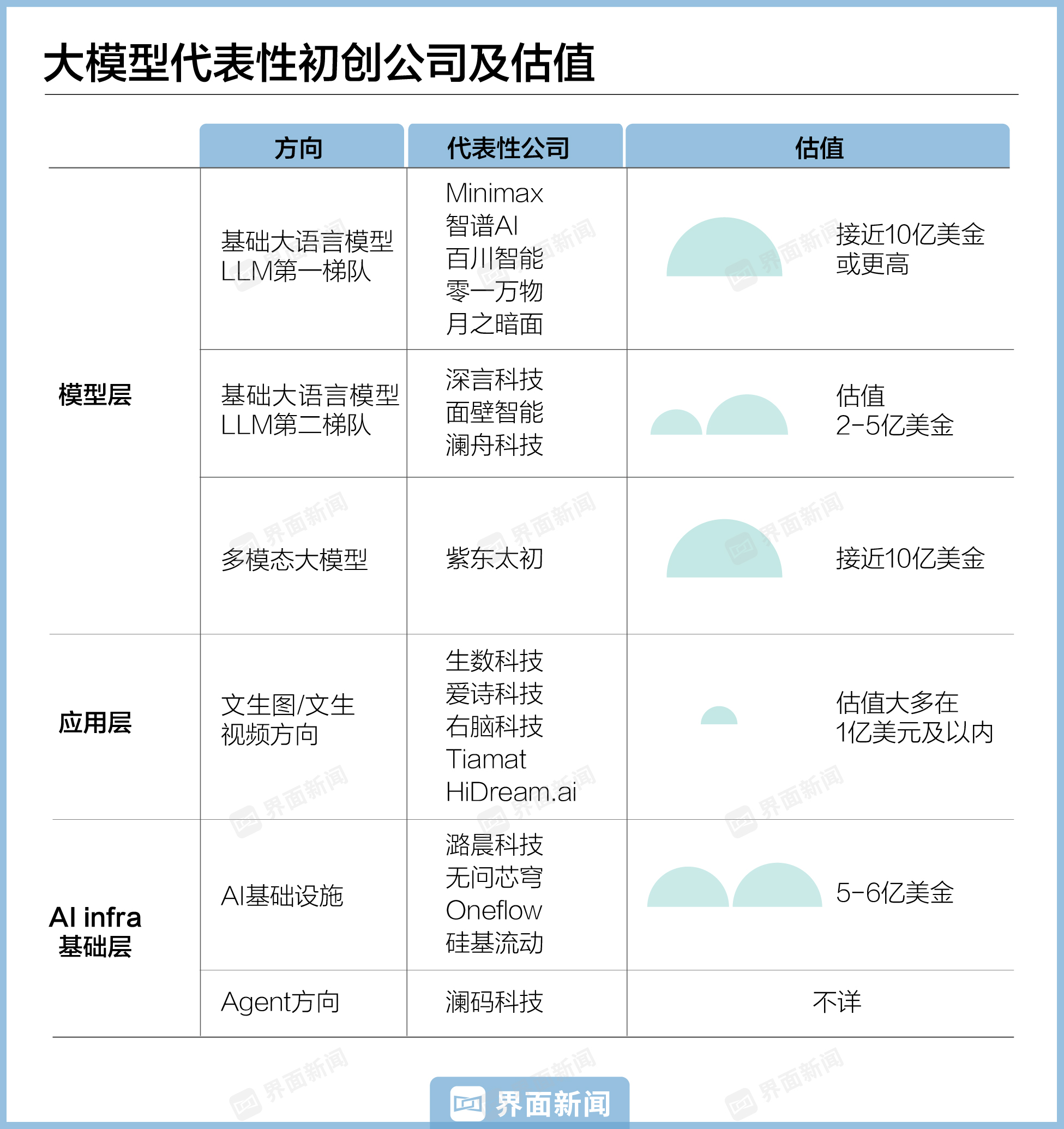 按照架构层次划分,大模型赛道初创公司从下至上可分为算力层、基础层、模型层及应用层。