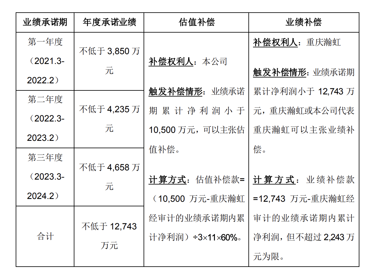 据对赌协议,对赌期三年,重庆瀚虹净利润应分别不低于3850万元、4235万元、4658万元,三年累计净利润不低于12743万元。若重庆瀚虹经审计的业绩累计净利润小于12743万元时,则对赌方应以现金方式向重庆瀚虹补足业绩差额,但不超过2243万元。