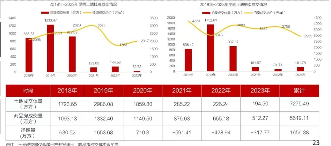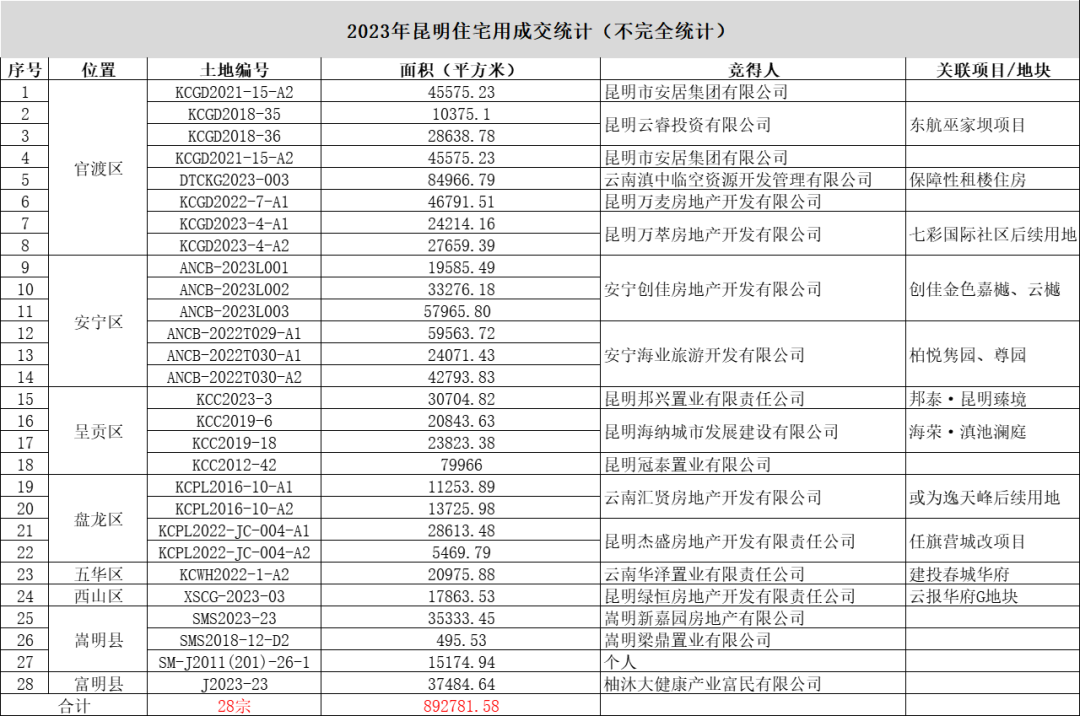 数据显示,2023年全年,昆明市城镇住宅用地共成交28宗,成交面积89.28万平方米。