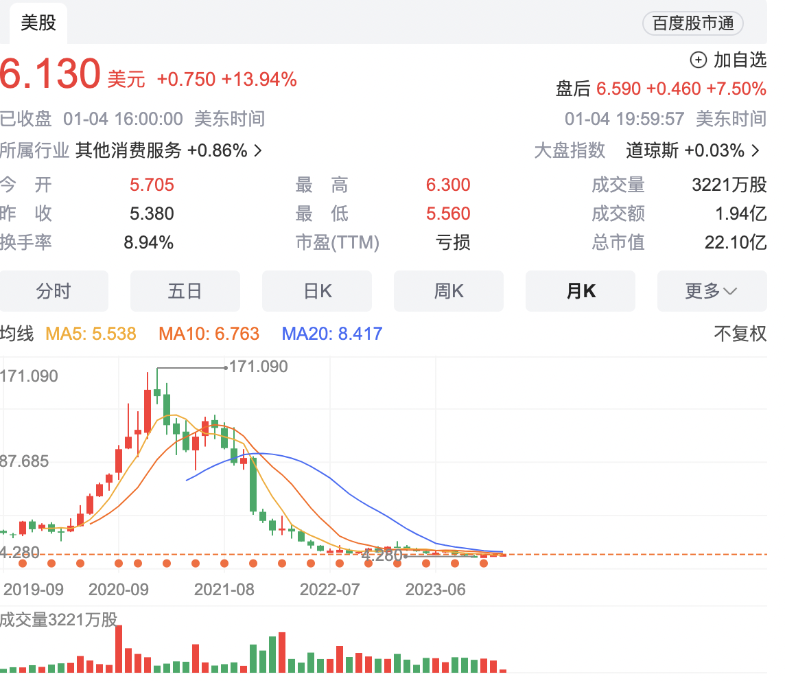当地时间1月4日,Peloton在美股收盘价仅6.13美元。2019年上市后,这家居家健身公司的股价一度高达171.09美元。如今其股价仅为当时的3%左右,且近三个月徘徊在7美元以下。