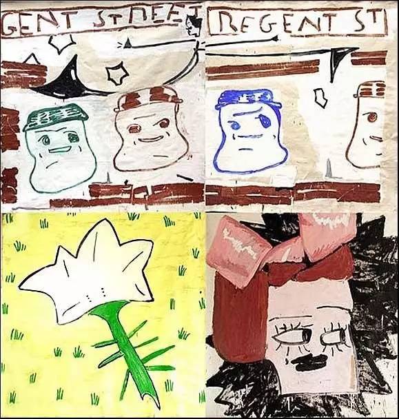 这种卡通式的画作,线条简单,色彩鲜明。虽然99%的凡人都看不懂,但足够好认。