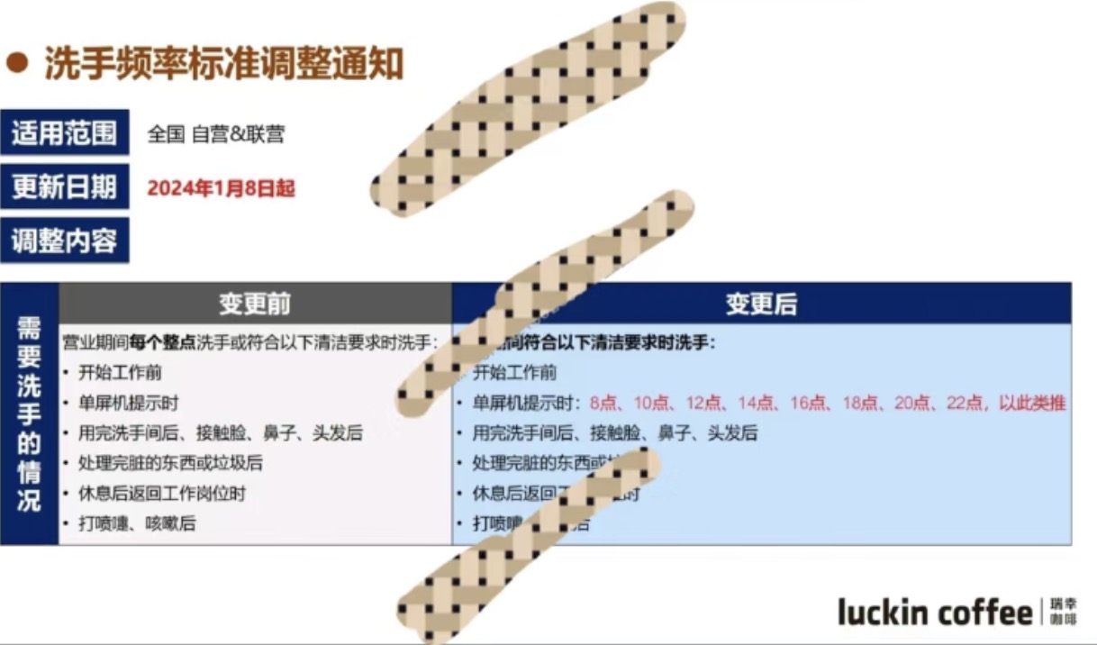 不过,根据部分员工在小红书上披露的“洗手频率标准调整通知”,在瑞幸店员需要洗手的六种情况中,调整最大的一处是,从此前的每个整点需要洗手,变更为从8点开始的每两个整点需要洗手,该通知适用于全国的自营和联营店铺。