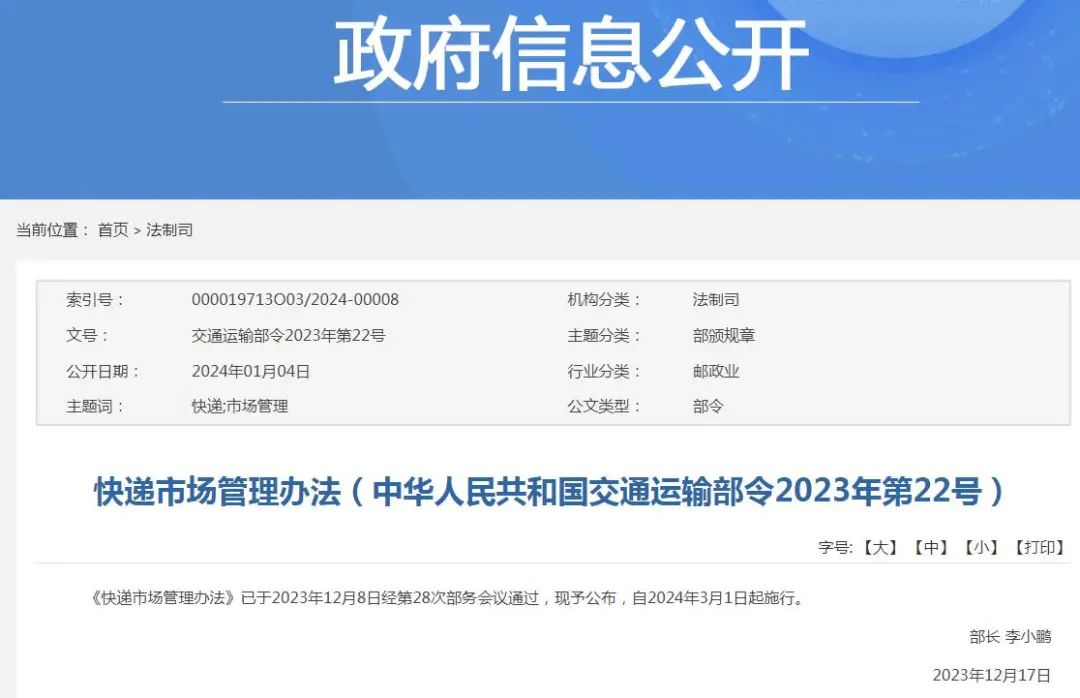 据交通运输部消息,修订后的《快递市场管理办法》于3月1日正式实施。办法对虚假签收、擅自投柜投站等行为作出明确规定,引导行业进一步规范化运营。