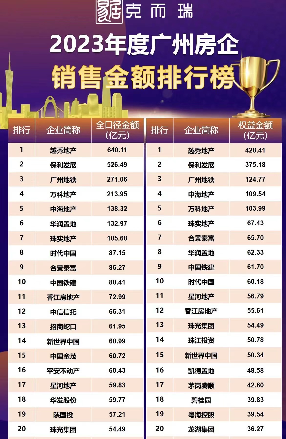 根据克而瑞发布的2023年广州房企销售排行榜,本地国企越秀地产以全口径金额640.11亿元、权益金额428.41亿元、流量金额642.42亿元及流量销售面积131.18万平方米,包揽四榜冠军。