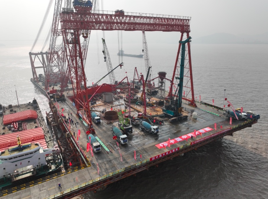 5号主塔墩自2023年7月正式开钻以来,项目建设管理单位沪杭客专公司组织施工单位中铁大桥局投入2台大直径旋挖钻机和2台ZJD7000型动力头钻机,实现分级成孔和全断面一次成孔。通过绑定在机头的数字化设备,钻孔参数可实时传到后台,确保成孔安全和质量。此外,还设立了气象站和船舶全要素监测预警平台。同时,项目投入2200吨浮吊、400吨龙门吊等大型起重设备,吊装钢护筒、安装钢筋笼,历经6个月完成钻孔桩施工作业,较原计划桩基工期大大提前。