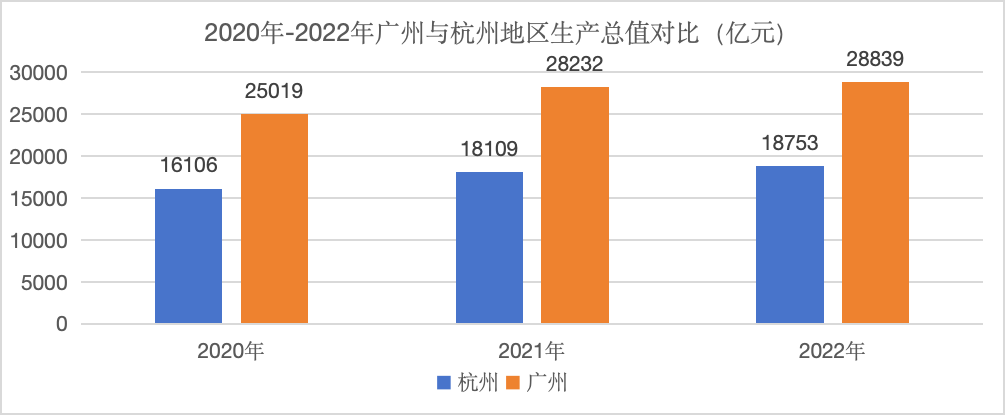 从经济总量来看,2022年,杭州实现地区生产总值(GDP)18753亿元,广州GDP达到28839亿元,杭州比广州差了1万亿元,大约是一个东莞的经济体量。