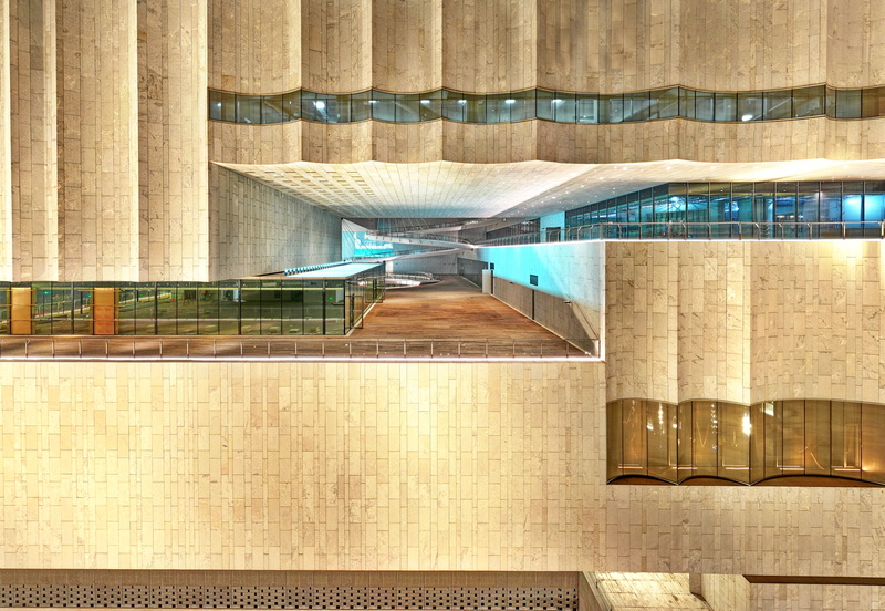 上博东馆占地面积约4.6万平方米,总建筑面积11.32万平方米,地上建筑6层,地下建筑2层,整体呈矩形,局部外立面用大理石蜿蜒包裹,有如大海波涛起伏。东馆强调开放性与共享性,每个楼层都有落地玻璃、平台或户外区域,引入自然光线。在功能布局上,东馆的建筑空间分为陈列展示区、公共服务区和配套功能区,约各占1/3。东馆陈列展示区总面积约3.36万㎡,馆内共设20个展厅和互动体验空间,包含文物类常设展13个、互动体验空间4个、特展厅3个。珍贵文物的展出比例将从人民广场馆的4%左右提高到10.5%。