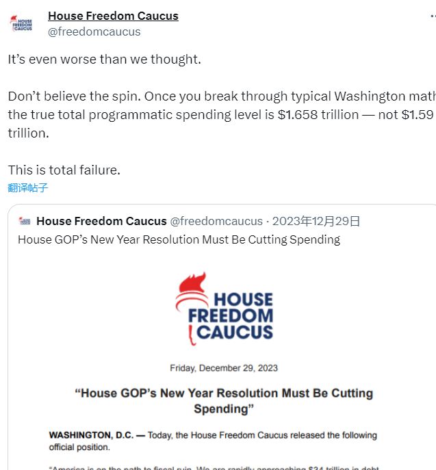 但约翰逊也承认协议不会让所有人满意,政府削减开支的程度并没有达到“我们大部分人期望”的。以“自由党团”为代表的共和党极右翼保守派一直要求将联邦政府新财年的支出减至1.47万亿美元,也就是2022财年水平。