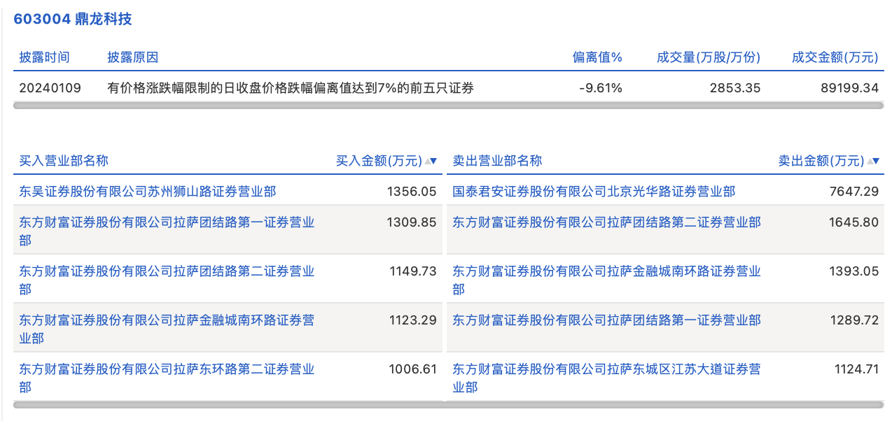 具体来看,国泰君安证券北京光华路证券营业部、东方财富证券拉萨团结路第二证券营业部分别卖出7647.29万元、1645.80万元;东吴证券苏州狮山路证券营业部、东方财富证券拉萨团结路第一证券营业部分别买入1356.05万元、1309.85万元。