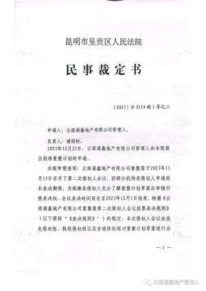 发布的消息内容显示,呈贡区人民法院核查后,于2023年12月26日作出(2023)云0114破1号之二号民事裁定书,裁定批准云南涌鑫地产有限公司重整计划,终止云南涌鑫地产有限公司重整程序。此次暂未公开披露重整计划的具体内容,暂无从得知重整投资人身份和具体投资方式。
