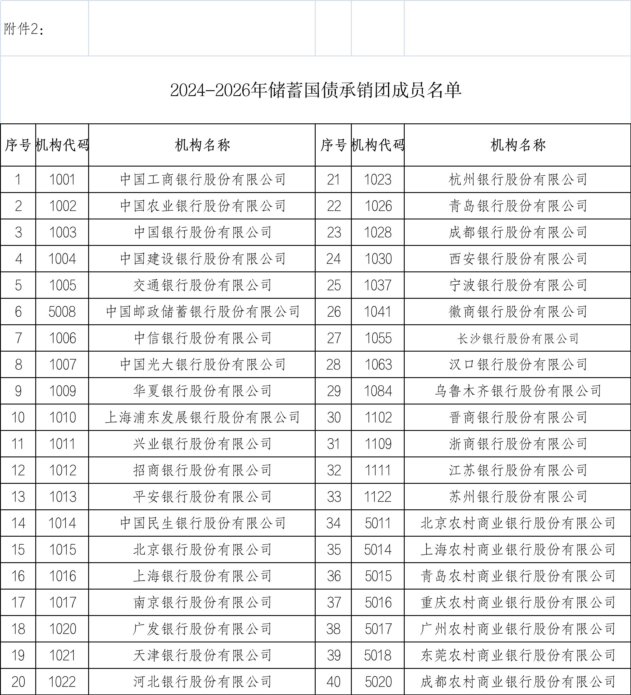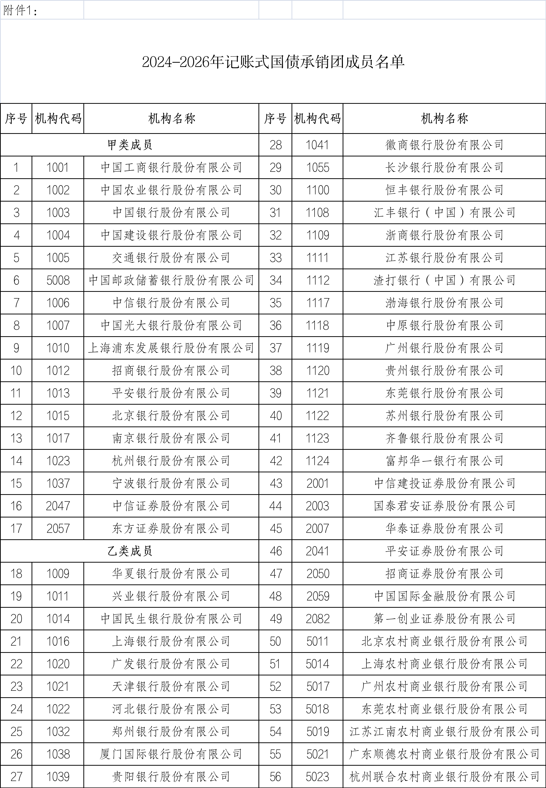 据财政部网站,根据《国债承销团组建工作管理办法》(财库〔2023〕24号)等规定,经专家评审、社会公示、签订国债承销主协议等环节,财政部会同中国人民银行、证监会确定中国工商银行股份有限公司等56家机构为2024-2026年记账式国债承销团成员,中国工商银行股份有限公司等40家机构为2024-2026年储蓄国债承销团成员。