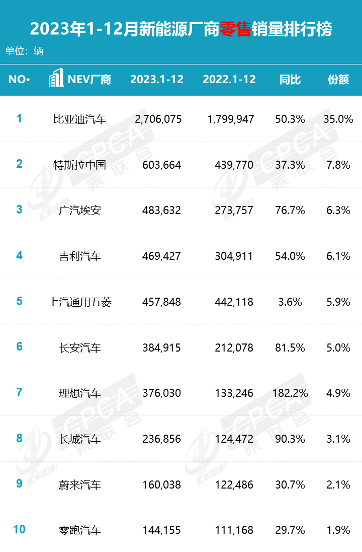 1月10日,乘联会发布2023年1-12月新能源厂商零售销量排行榜,比亚迪汽车、特斯拉中国、广汽埃安分别以35.0%、7.8%、6.3%的零售份额位居前三。