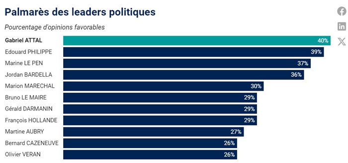 益普索上月的民调显示,在法国政客中,阿塔尔的受欢迎度达到40%,超过法国前总理菲利普和极右翼国民联盟领导人勒庞,排名第一。