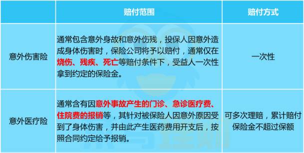 意外险是有分类的,一共两类——意外伤害险和意外医疗险,虽然名字都差不多,但赔付差别还挺大,具体的差别可以看下图: