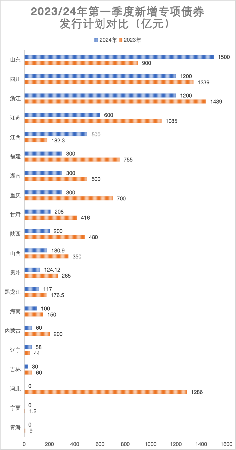 银河证券首席经济学家章俊对界面新闻表示,从目前已披露的发行计划来看,化债大省一季度新增专项债发行规模大幅缩减,例如贵州、重庆、湖南等省份,而化债压力较小的山东省今年一季度新增专项债发行规模达1500亿元,较去年同期的900亿元大幅提升。