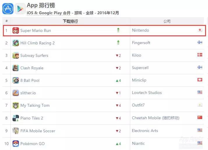 在全球iOS&Google Play游戏下载排行中,《超级马里奥Run》如愿登上了全球TOP1的位置,同时它也带动了任天堂成为了全球下载排名第二的游戏厂商。拥有31年超级IP的马里奥在上线前已经备受关注,12月15日全球150多个地区同步上线后,12个小时就拿下103个地区的免费总榜第一,上线3天下载量高达3700万。
