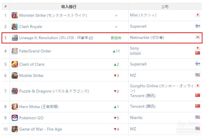 另外值得注意的是,在全球iOS&Google Play游戏收入榜上,新上线的韩国Netmarble动作手游《天堂2:革命》一跃成为第三名,这是端游《天堂2》的正统改编之作。而这款产品在2016年8月被腾讯签下,并且更名为《天堂2:重生》,预计在2017年上半年上线。