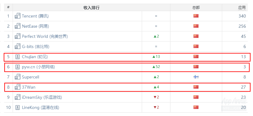 国内除腾讯网易之外,游戏厂商收入TOP3-TOP10的竞争依旧非常激烈。初见科技在12月凭借几款游戏的出色表现取得第五的成绩,上升了13名。37手游则上升4名,排于第八。而值得重点关注的是,朋友玩仅仅依靠3款游戏,在去年12月的企业排名中上升了52名,一跃拿下了国内iOS收入发行商TOP6。