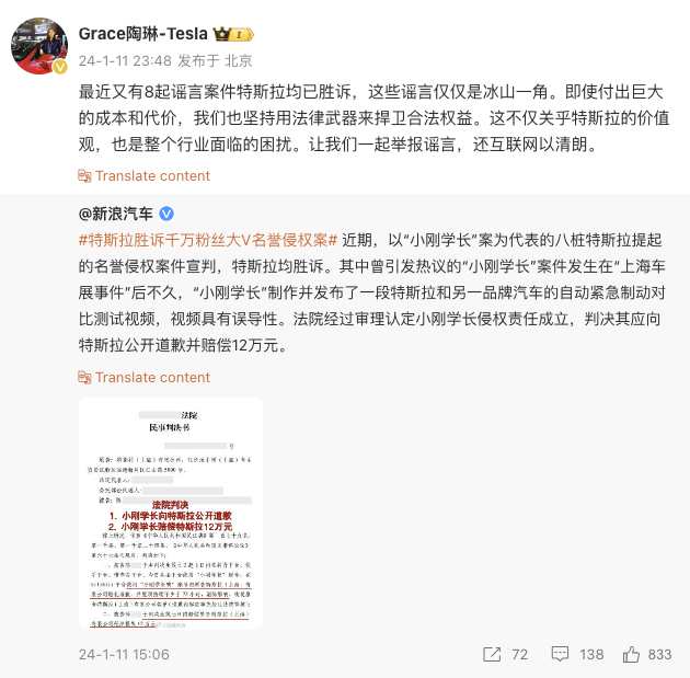 1月11日晚,特斯拉全球副总裁陶琳在微博透露,最近又有8起谣言案件特斯拉均已胜诉。陶琳表示,“即使付出巨大的成本和代价,我们也坚持用法律武器来捍卫合法权益。这不仅关乎特斯拉的价值观,也是整个行业面临的困扰。”