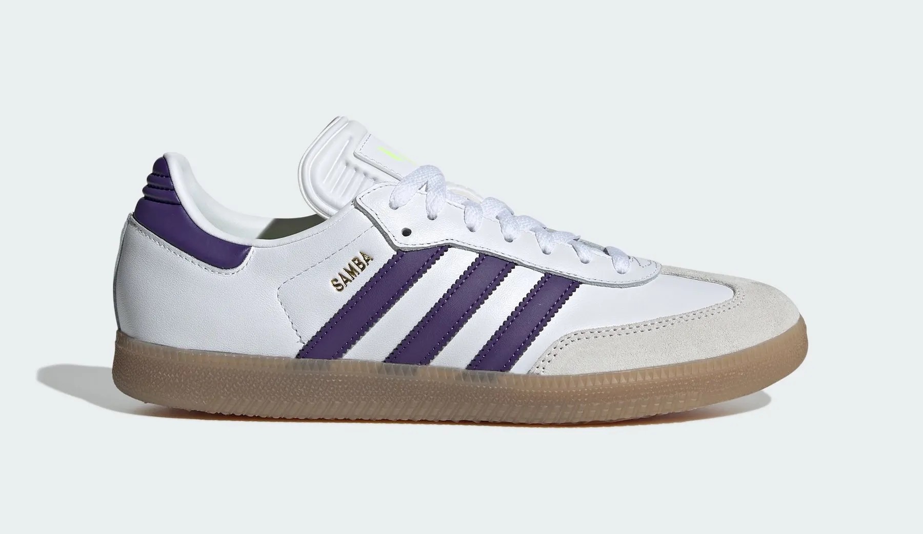 从曝光的产品图上看,联名款鞋面采用皮革和绒面革,和Samba系列的大部分鞋款材质相同。颜色上,阿迪达斯经典的三道杠标志使用紫色。鞋舌处则有黄色的梅西签名,体现该鞋的联名身份。