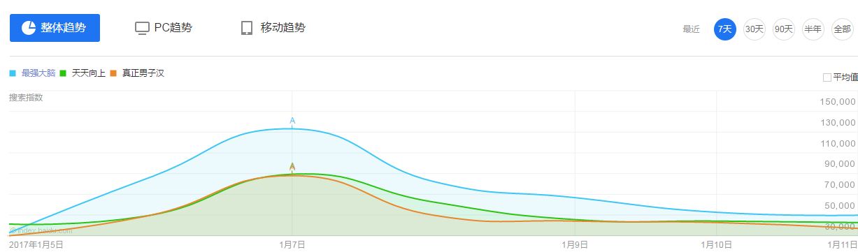 开播后百度指数(蓝色)迅速超过《真正男子汉》(橙色)和《天天向上》(绿色),