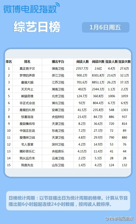 2017开年第一档回归的综艺当属江苏卫视的《最强大脑》,在1月6日首播以1.21%的收视率拿到了夜间节目第三名。