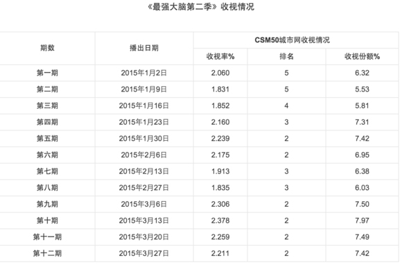 第二期收视率开始下跌至0.699,只排到了周五晚第五位,周杰伦的回归并没能带动《最强大脑》的收视率。
