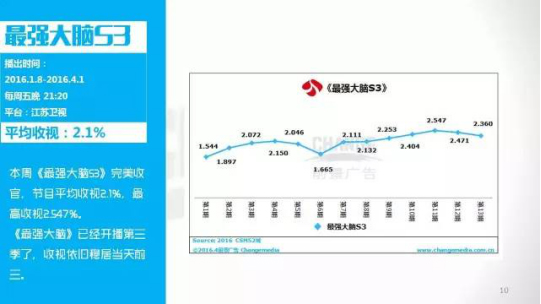 而第二季《最强大脑》首播收视率为2.060%,全城收视网排名第五,第三季首播收视率也有1.544%。从纵向上看《最强大脑》第四季首播1.21%的收视反而下跌,成为四季最低收视率。