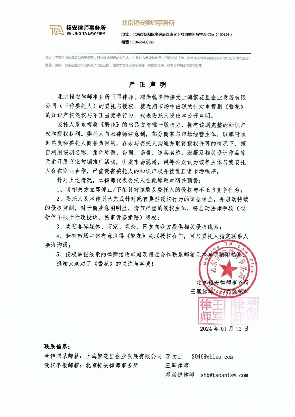 北京韬安律师事务所声明称,近期部分商家与市场经营主体以攀附《繁花》热度和委托人上海繁花里企业发展有限公司商誉为目的,在未获授权情况下,利用该剧相关元素开展商业营销活动,误导公众、扰乱市场,侵害委托方知识产权,要求停止侵权行为,并表示对严重侵权主体将启动法律手段维权。