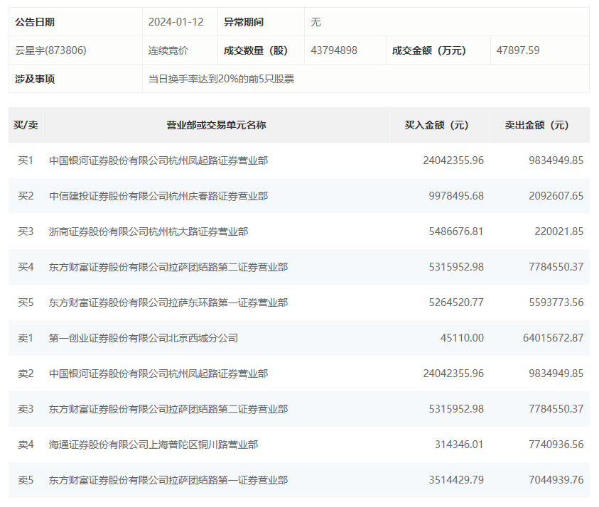 1月12日,云星宇今日跌15.41%,全天换手率达57.67%,振幅达10.46%。龙虎榜数据显示,营业部席位合计净卖出5036.56万元。其中,第一创业证券北京西城分公司、中国银河证券杭州凤起路证券营业部分别卖出6401.57万元、983.49万元;中国银河证券杭州凤起路证券营业部、中信建投证券杭州庆春路证券营业部分别买入2404.24万元、997.85万元。