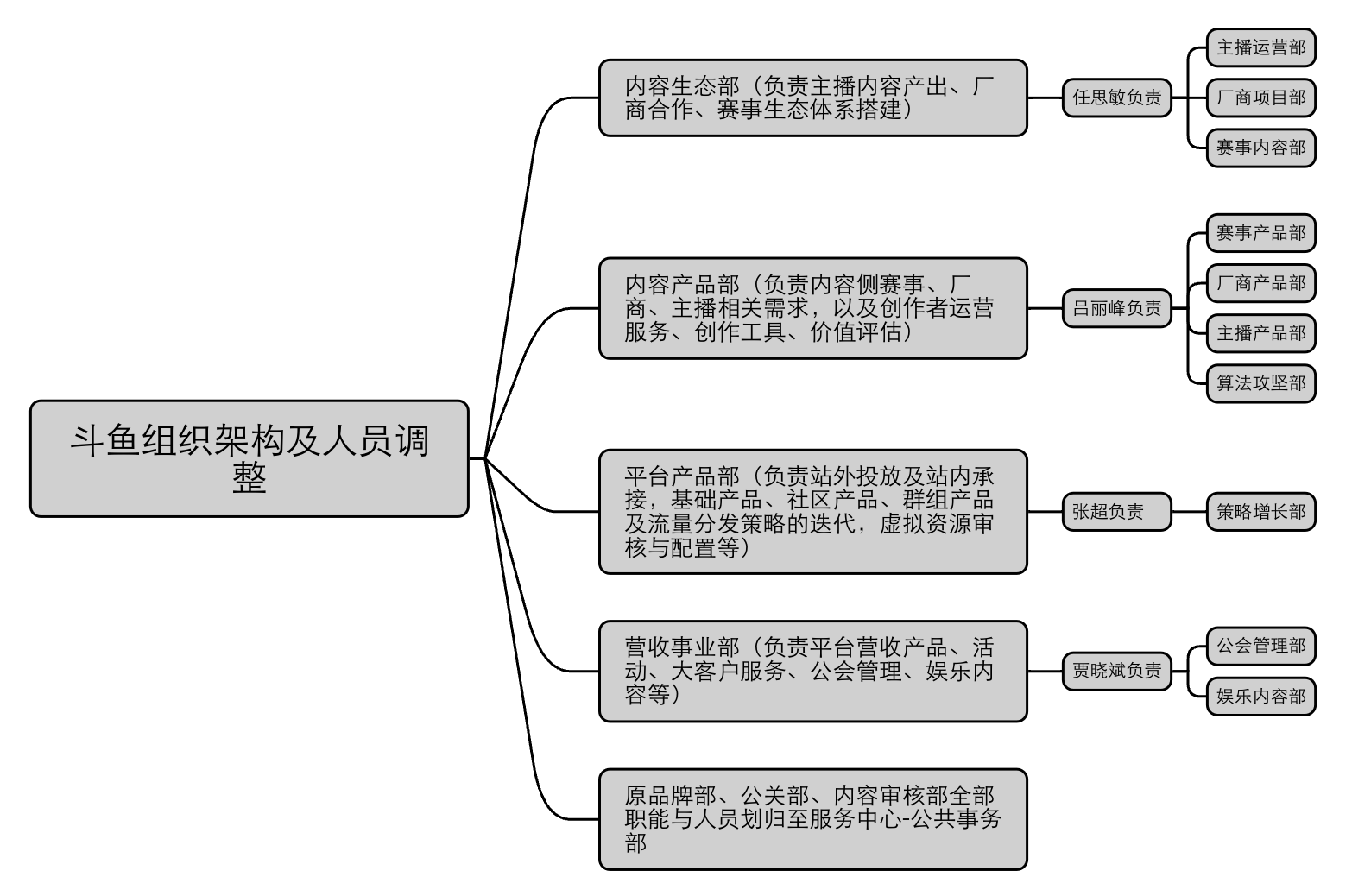 值得注意的是,此次斗鱼对主播运营及赛事内部等核心业务的组织架构进行了调整,不再按照分区、分项目的逻辑,而是进行了资源的统一整合。