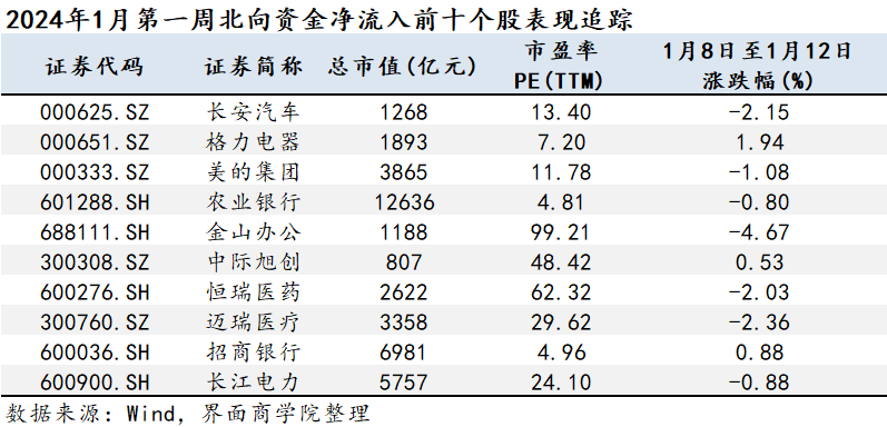 下图为上期2024年1月第一周北向资金净流入前十大个股的后续表现情况。数据截至2023年1月12日,追踪区间为2023年1月8日至1月12日。排序以上期资金净流入为基准。