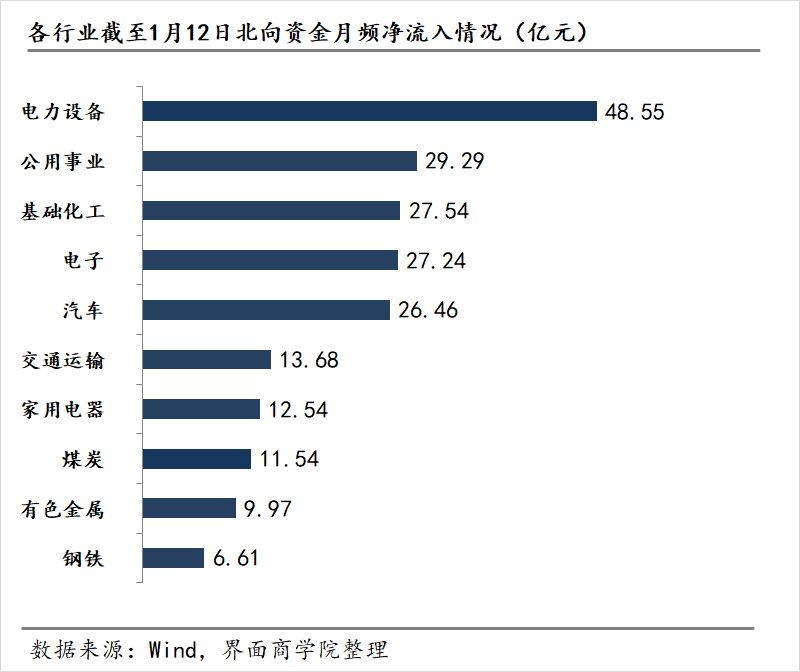 以申万31个一级行业为基准,Wind数据截至1月12日的月频申万一级行业数据显示,北向资金流入显著的前三板块分别为电力设备、公用事业以及基础化工,月流入分别为48.55亿元、29.29亿元和27.54亿元。而北向资金撤出的前三板块分别为食品饮料、非银金融以及计算机,月流出分别为54.31亿元、47.95亿元与21.74亿元。