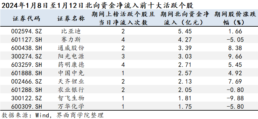 从北向资金活跃个股净流入金额上看,比亚迪(002594.SZ)、赛力斯(601127.SH)、通威股份(600438.SH)为1月第二周北向资金净流入的前三。