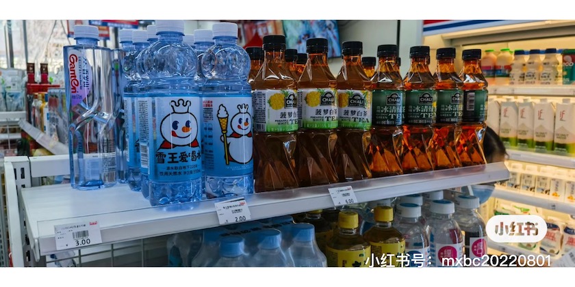 而这些产品大多在蜜雪冰城强势的河南或四川周边“随机掉落”,出现的地点通常是蜜雪冰城门口的展示架或便利店、小超市,即使后续蜜雪冰城瓶装水也进入了成都、重庆的罗森便利店等渠道,但受地域限制最终也没有掀起多少水花。