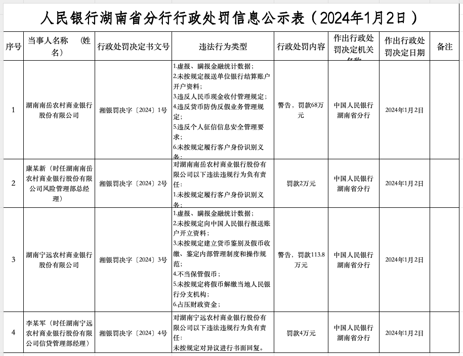 1月15日,根据中国人民银行湖南省分行行政处罚信息公示表,2024年1月2日,湖南南岳农村商业银行股份有限公司被警告,并处罚款68万元。违法行为类型为:1.虚报、瞒报金融统计数据;2.未按规定报送单位银行结算账户开户资料;3.违反人民币现金收付管理规定;4.违反货币防伪反假业务管理规定;5.违反个人征信信息安全管理要求;6.未按规定履行客户身份识别义务;7.未按照规定报送大额交易报告或者可疑交易报告。