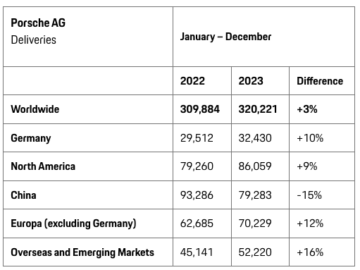 1月15日,根据保时捷公布的数据,该跑车制造商2023年全球交付320,221辆,同比增长3%,其中保时捷911车型交付量同比增长24%至50,146辆,卡宴车型交付量同比下降8%至87,553辆。中国市场方面,保时捷2023年交付量为79,283辆,同比下降15%。