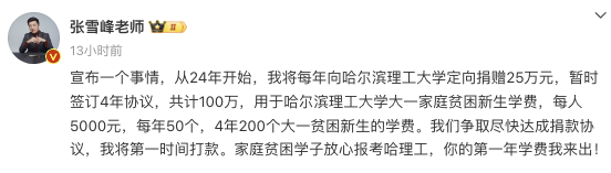 张雪峰称将向哈理工捐款100万