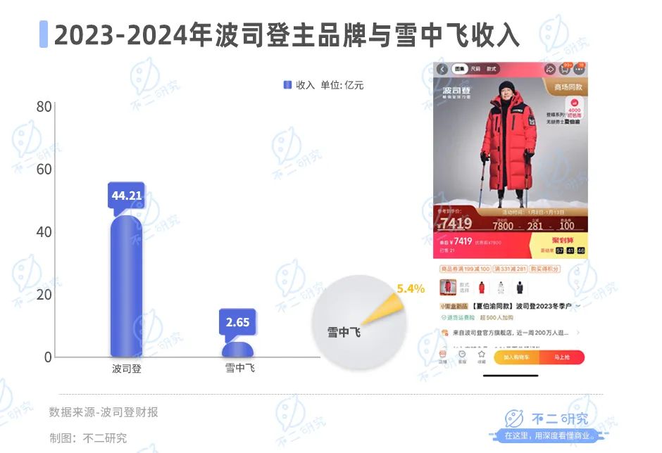 据2024财年中期业绩数据,波司登主品牌收入44.21亿元,雪中飞品牌营业收入仅2.65亿元,在羽绒服板块占比5.4%,远不及主品牌波司登的收入规模。