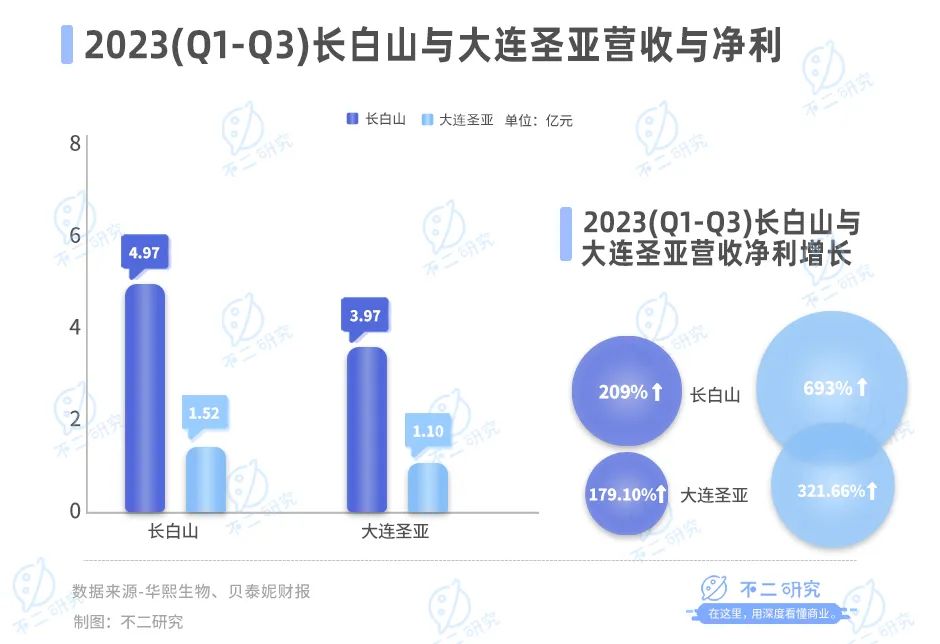 「不二研究」据两者的三季报发现:今年前三季度,长白山、大连圣亚的营收分别为4.97亿元和3.97亿元;营收增速分别为209.37%、179.1%。