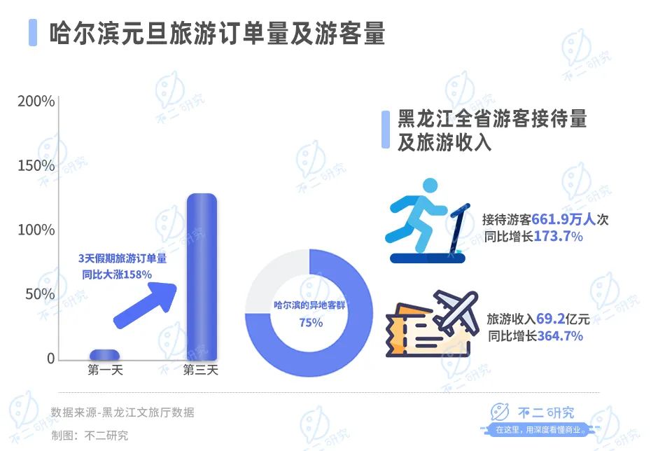据携程统计,哈尔滨冰雪大世界在元旦假期第二天暂停售票,元旦假期内,哈尔滨的异地客群占比75%,主要来自上海、深圳以及北京,3天假期旅游订单量同比大涨158%。