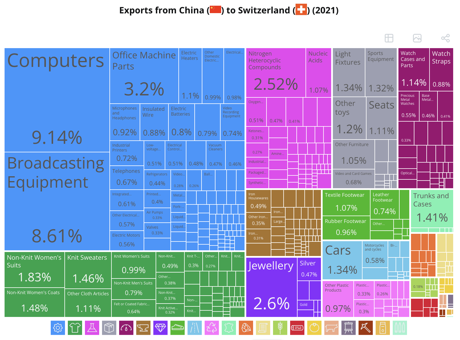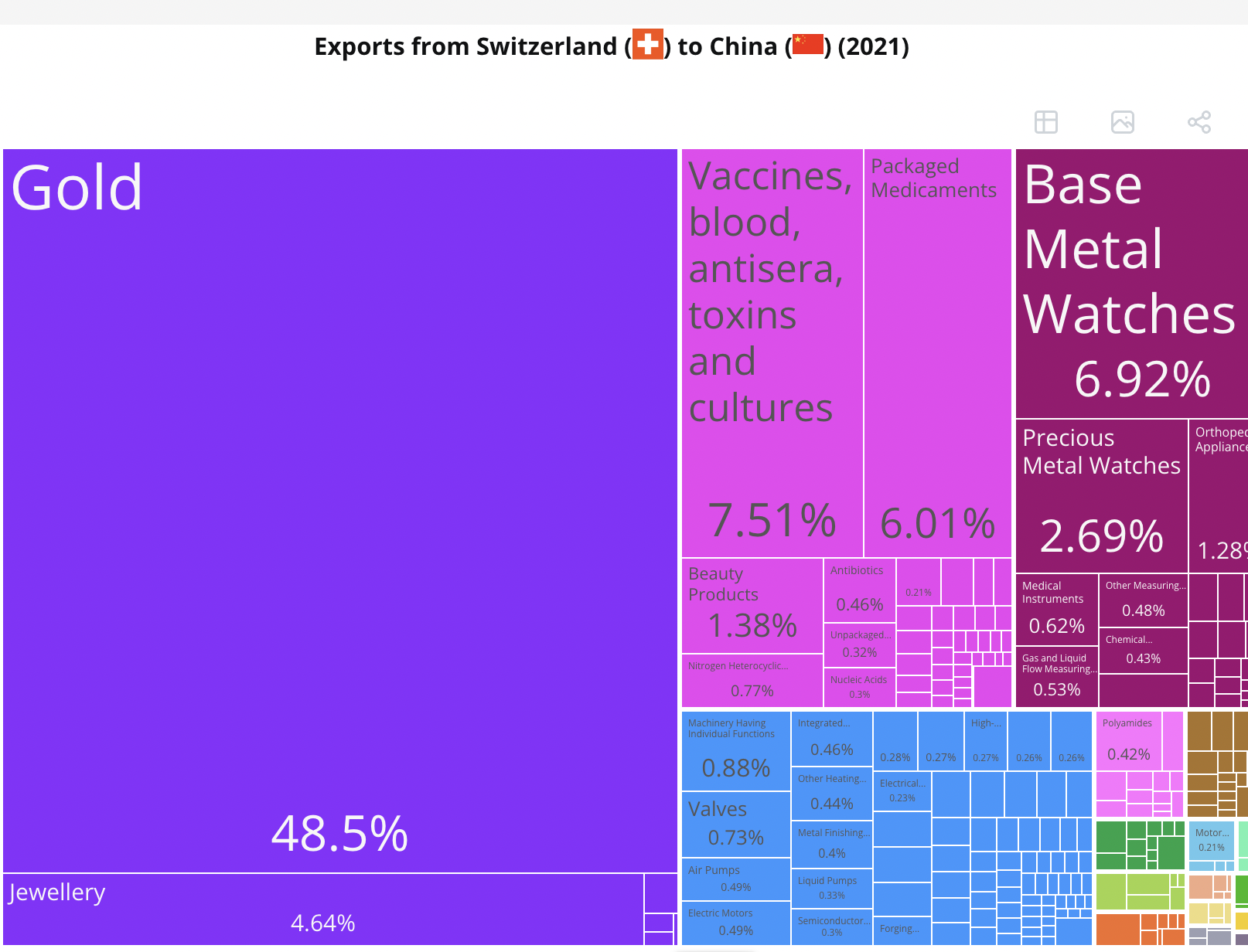 中国对瑞士的出口主要集中在计算机产品、广播设备和办公设备零部件等领域。据美国贸易监测机构“经济复杂性研究中心”(OEC)数据,在1995年-2021年间,中国对瑞士的出口年增长率为11.7%。而瑞士对华出口则集中在黄金,疫苗、血液、抗血清、毒素和培养物,以及珠宝、手表等领域。在上述时间段内的对华出口年增长率为14.9%。
