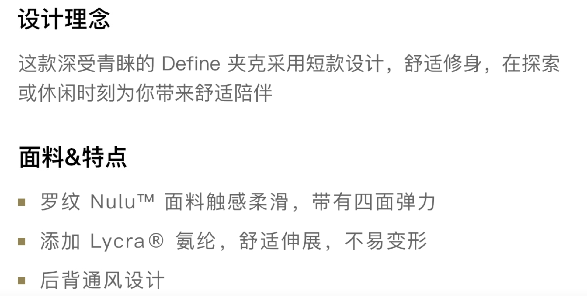 与此对应的是,lululemon在针对产品展开宣传时,也更强调产品与消费者体验的关联,会讲述其用料、做工对于穿着体验和性能的作用。