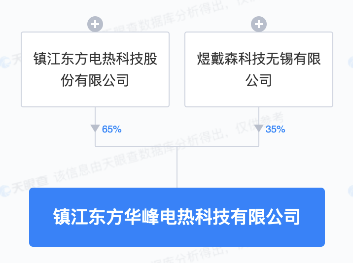 天眼查APP显示,镇江东方华峰电热科技有限公司成立,法定代表人为谭伟,注册资本4000万元,经营范围包含:汽车零部件研发;汽车零部件及配件制造;五金产品零售;模具制造等。天眼查股权穿透显示,该公司由东方电热、煜戴森科技无锡有限公司共同持股。